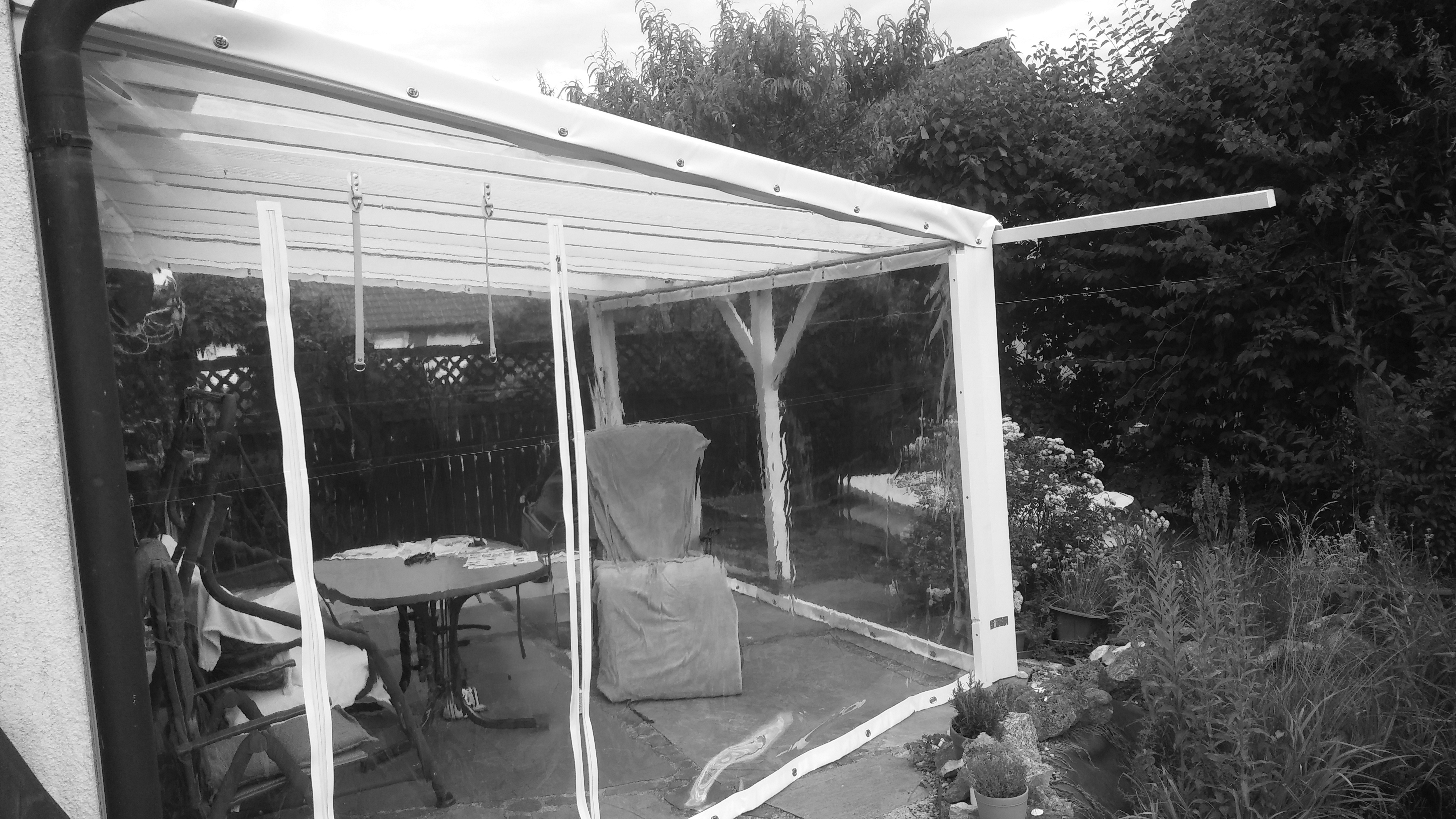 Besonders bei Terrassenüberdachungen mit schrägen Seiten oder geneigten Dächern kommen PVC-Plachen mit abgeschrägter Seite zum Einsatz. Sie passen sich den spezifischen Neigungswinkeln der Konstruktion perfekt an und bieten zuverlässigen Schutz vor Regen, Wind und UV-Strahlen. So bleiben Terrassenmöbel, Bodenbeläge und andere empfindliche Bereiche stets geschützt – unabhängig von der Wetterlage.